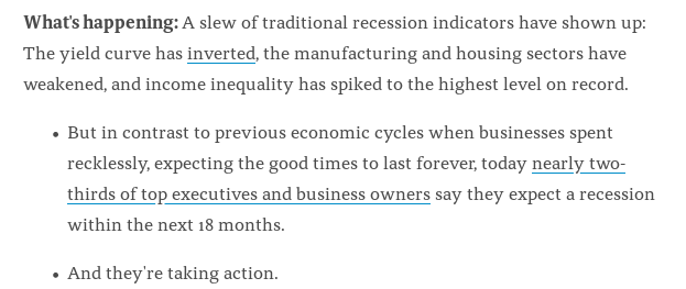The Trump Recession has started. There is no way of avoiding it now. Nearly two thirds of top executives and business owners say they expect a recession and they have been making financial plans accordingly.