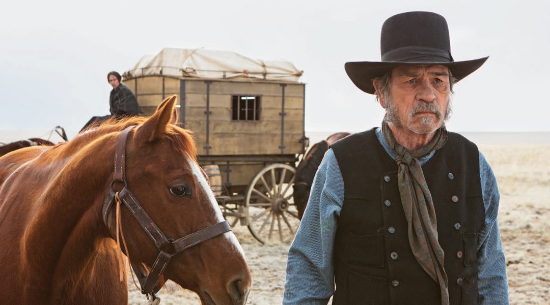 Along the way she runs into Tommy Lee’s character hanging from a rope, sitting on his horse, and hires him to help her. Nobody else in this God fearing town would go with her on the five week journey through Indian territory.