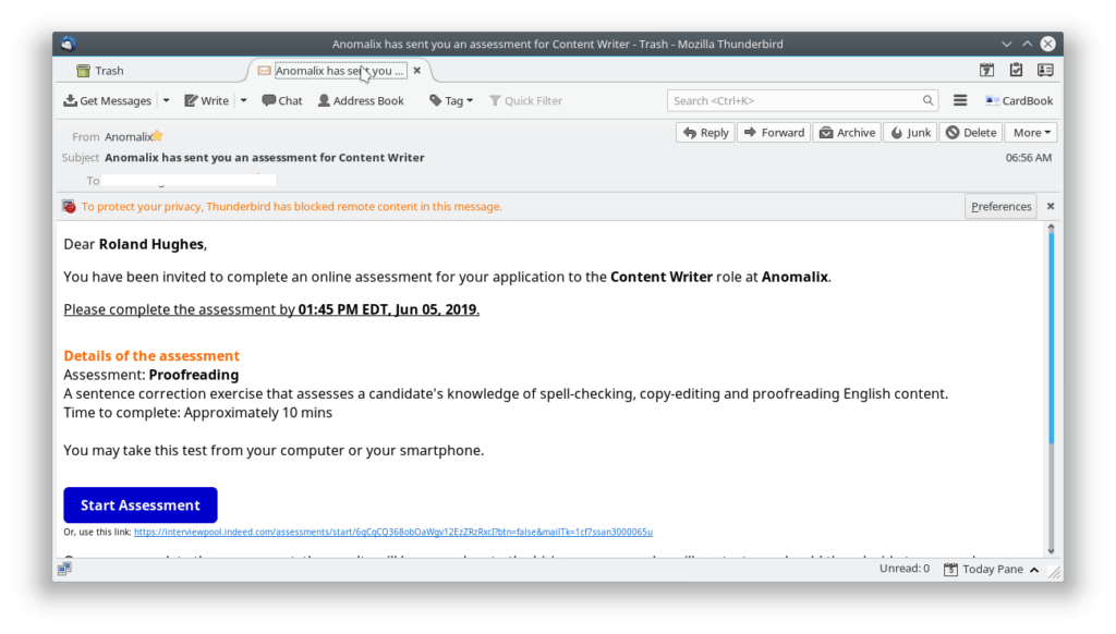 Whenever you click on a job/contract link and almost immediately get an automated test email, this is a bottom feeder. I was forced to empty my trash recently or I could take a picture of another new bottom feeder technique. Automated interview questions. I kid you not. This wasn’t an email with a list of questions for you to type answers to, they wanted you to click a link which would either initiate a robo call to your cell phone, or, if your computer had a microphone let you verbally record your answers. If the recruiter actually looked at your resume they could then choose to hear your answers.